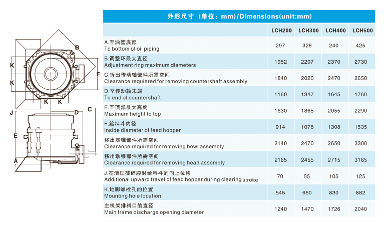 樂礦LCH 系列圓錐破碎機(jī)是以樂礦多年積累的破碎機(jī)生產(chǎn)經(jīng)驗(yàn),同時(shí)吸收借鑒了當(dāng)今歐美新型破碎機(jī)的設(shè)計(jì)理念和先進(jìn)技術(shù)制造而成。樂礦LCH 系列圓錐破碎機(jī)因其結(jié)構(gòu)堅(jiān)固、用途廣泛的特性,充分適用于選礦廠的晝夜連續(xù)生產(chǎn)和高破碎比的作業(yè)環(huán)境,并且通過技術(shù)創(chuàng)新減少了維修量、降低了運(yùn)行成本,并能提供液壓調(diào)整、過載保護(hù)和清腔等先進(jìn)功能。經(jīng)實(shí)踐證明:樂礦LCH 系列圓錐破碎機(jī)可提供更高的生產(chǎn)能力、更佳的產(chǎn)品形狀,而且易于自動(dòng)控制,具有更大的可靠性和靈活性,真正為客戶創(chuàng)造更多價(jià)值。